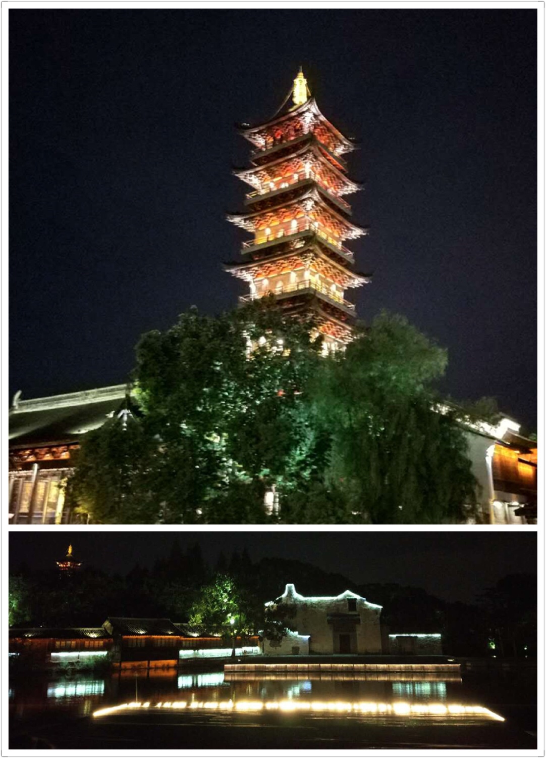 夜幕渐渐暗了下来,我们满是期待的想一探乌镇在夜色中的另一种姿态。五颜六色的灯光相互映衬,白莲寺中的高塔灯火通明。